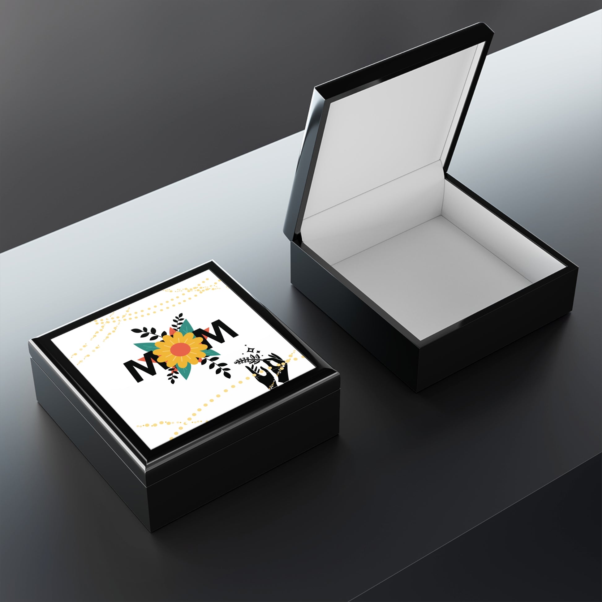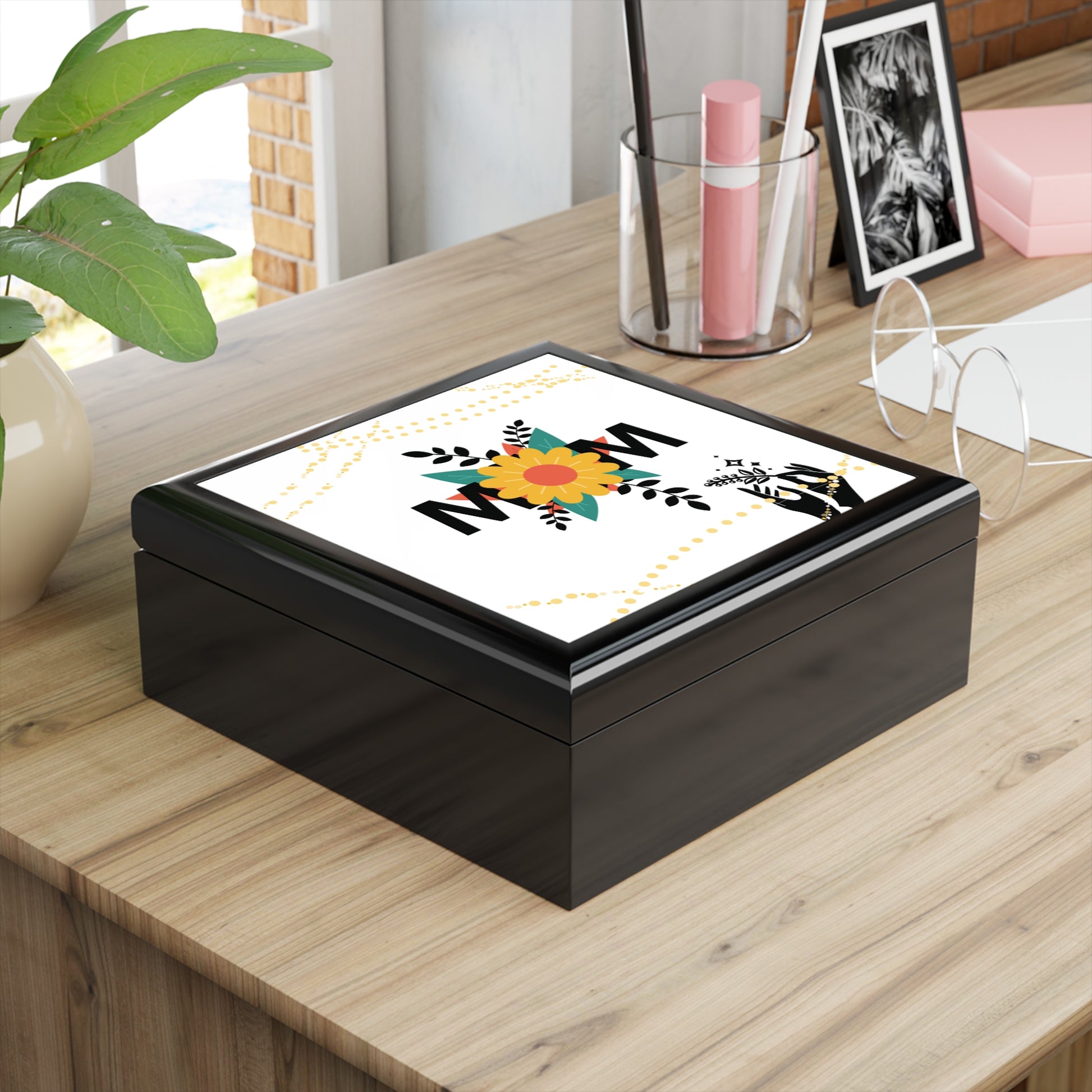 A small, elegant jewelry box crafted from high-quality rubberwood and finished with a glossy varnish. The lid displays a vibrant 6" x 6" glossy ceramic tile with a cheerful floral MOM design that brightens a dressing table or bedside. Inside, soft felt lining cradles rings, necklaces, and keepsakes, while dual hinges hold the lid open at a steady 90° for easy access. A slip-resistant felt base keeps the box secure on vanities and nightstands. This piece blends everyday practicality with a personal, handcrafted feeling — a calm, polished spot to store the little things that matter.