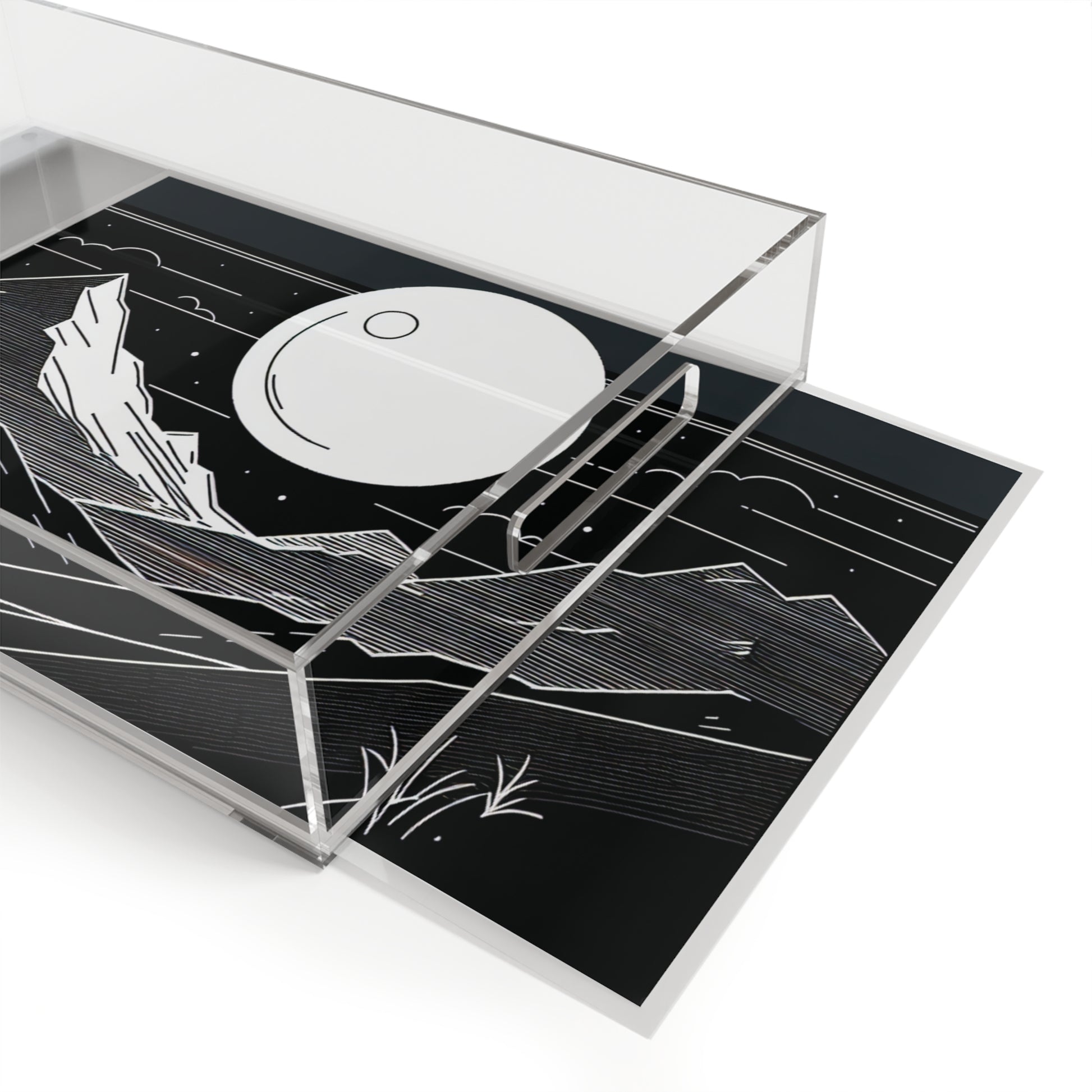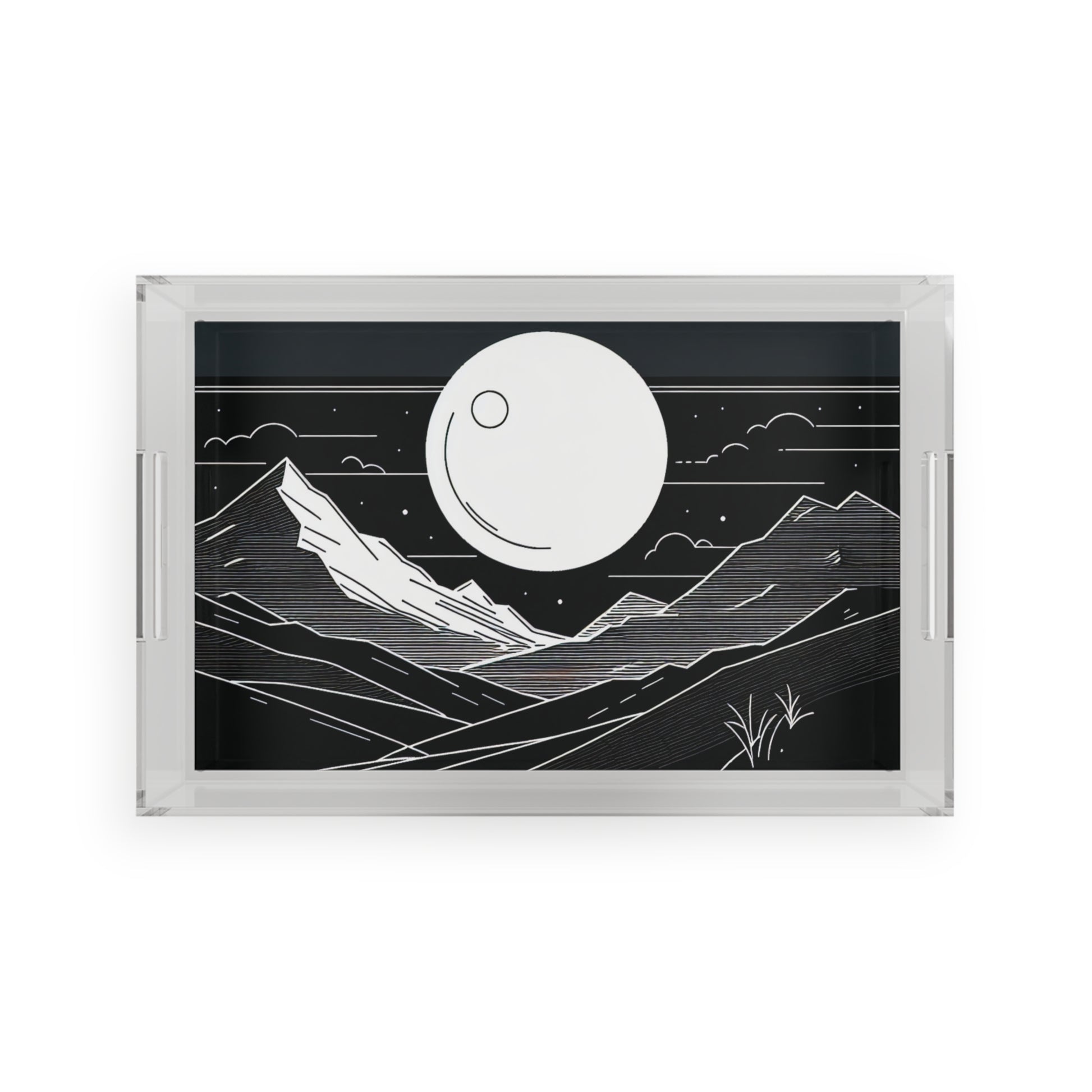 A clear acrylic serving tray that feels like a quiet night hike turned into tabletop art. The black-and-white mountain scene with a luminous moon rests beneath a laminated insert, offering a glass-like depth that draws the eye. Lightweight yet sturdy, the tray moves from coffee table to bedside to kitchen island with calm confidence. Use it to corral candles, display small ceramics, or carry drinks while sharing stories under low light. Its minimalist, nature-driven look brings a contemplative, modern touch to cozy evenings and intimate gatherings.