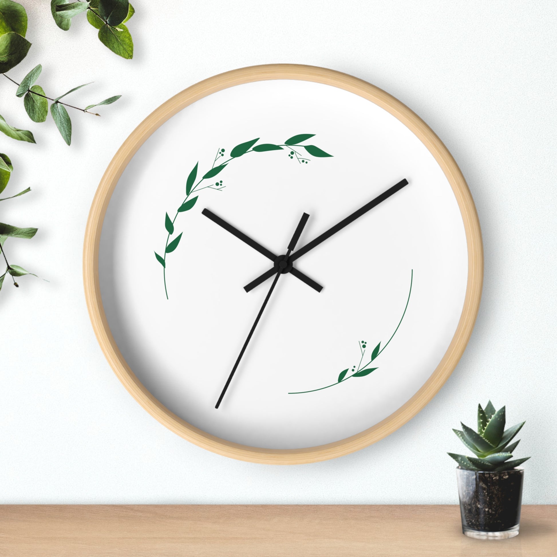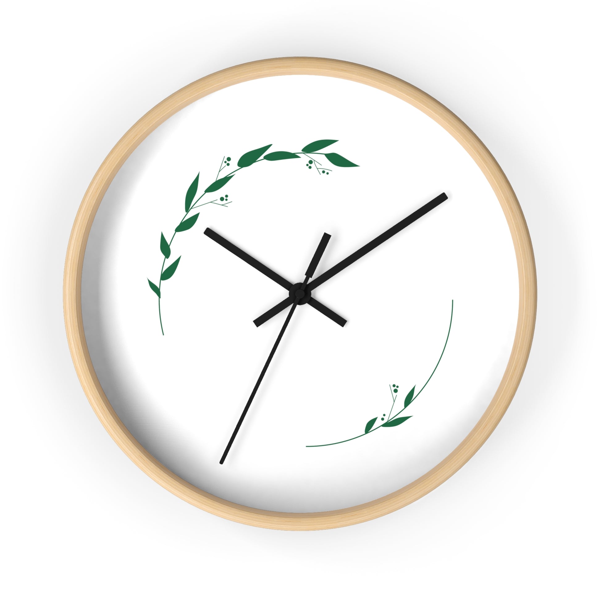 A quietly elegant wood wall clock that brings a touch of calm and nature to any room. The slim 10" face features a delicate wreath of hand-drawn leaves in soft green, letting negative space breathe around a simple, modern dial. Natural wood, black or white frame options let you match farmhouse, Scandinavian, or minimalist decor. The whisper-quiet movement and pre-installed hanging hook make it easy to place above a desk, in a reading nook, or on a kitchen wall where subtle beauty matters most. This clock reads like a small, living artwork — gentle, restrained, and steady — adding a sense of slow, intentional time to your everyday moments.