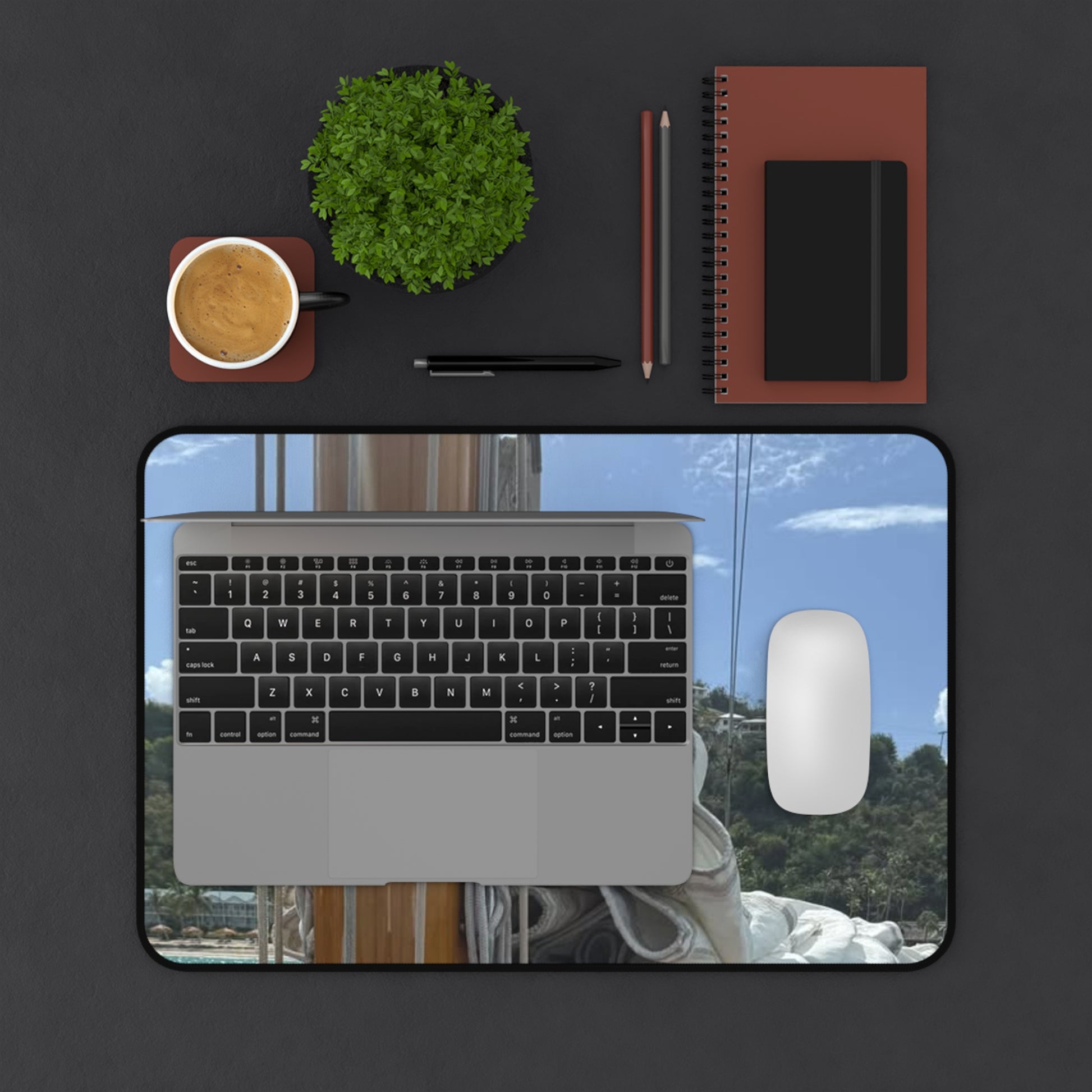Spread out a calm harbor on your desk. This neoprene desk mat brings the quiet geometry of sails, rigging and warm wood into your workspace — a soft, stable surface for typing, sketching or morning coffee. The image reads like a travel snapshot: sunlight on canvas, blue sky, and a hint of shoreline. It settles the senses and frames your tools so you can focus on the work that matters. The stitched edges and anti-slip backing keep the scene intact through daily use, while vivid printing preserves the soft contrast and color of the original photo. Available in three sizes, it fits a compact laptop nook or a wide creative desk, and layers easily into a studio, home office, or a boat-lover’s corner.